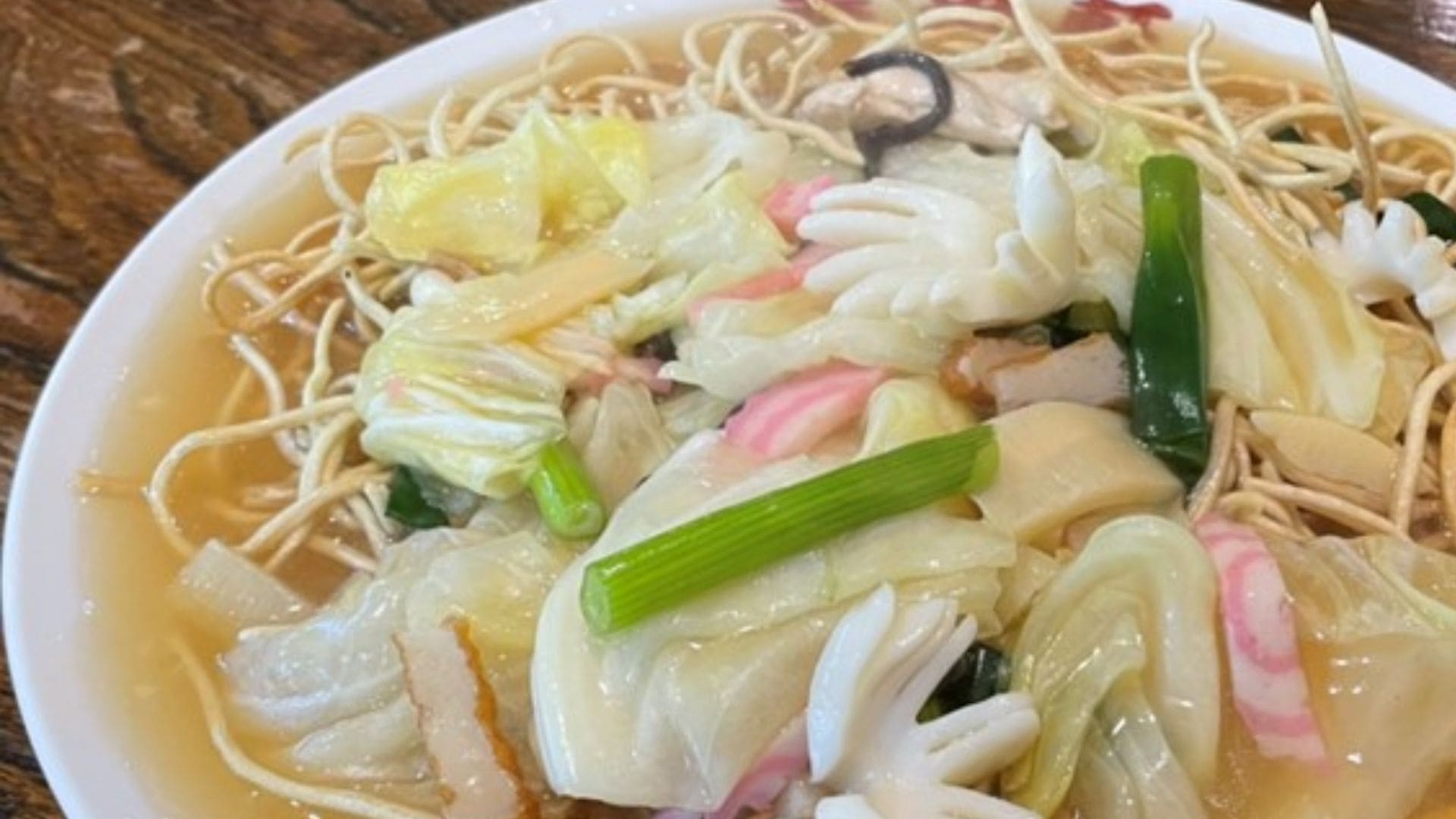 かた揚げ麺に野菜たっぷりのあんかけ。 ばりばり堅いまま・ちょっと時間をおいてやわらかく♪お好みの状態で食べられるのも◎